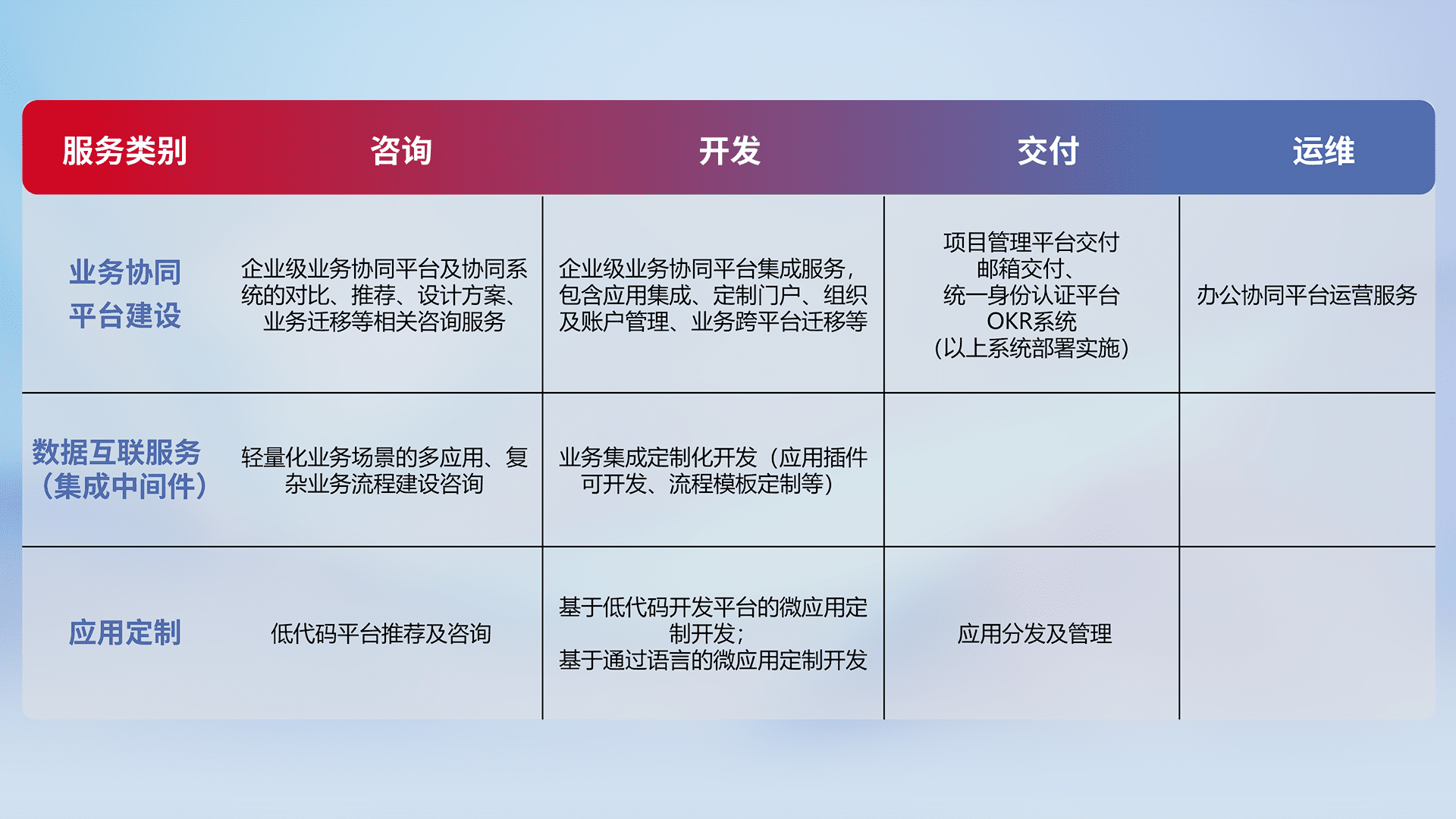 针对钉钉、、企微、、IDaas等平台级产品提供产品的规划、、方案、、交付、、、定制化开发等服务,,,实现如统一协同办公、、、智能客户服务、、、混合会议管理、、智能数据查询、、等业务场景,,,实现数字化转型。。