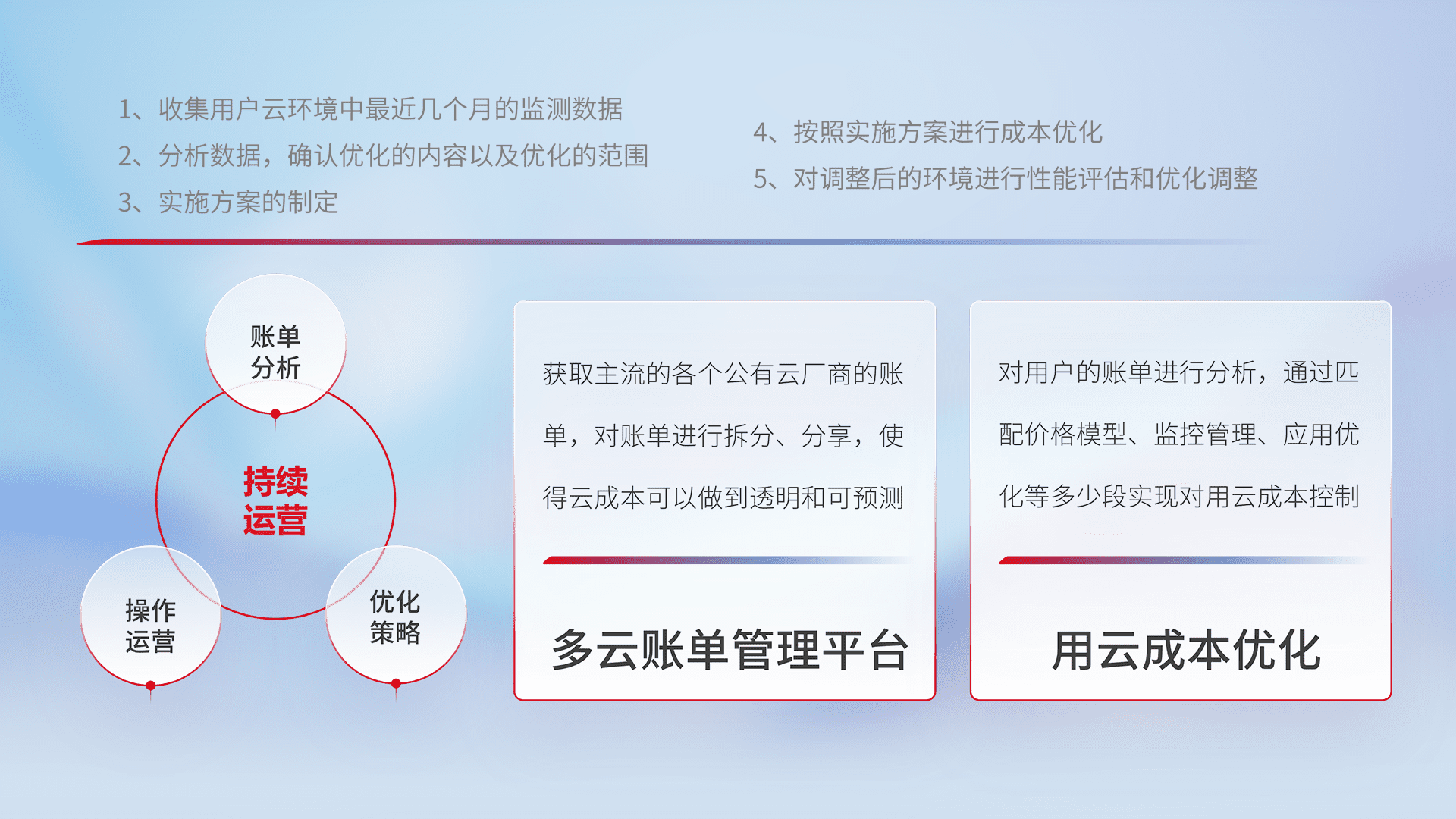 通过多云纳管,,,以统一的资源数据模型把客户的云资源进行抽象和封装,,,进而实现对多云资源的统一操作,,保障云资源管理的可靠性、、、、稳定性与可用性。。。。量身定制化运维内容,,配置、、、、开发运维、、、、补丁管理、、备份、、监控、、、、认证和访问管理、、、审计和日常巡检等,,,保障在用云过程中的可靠度,,稳定度以及高可用率。。。。